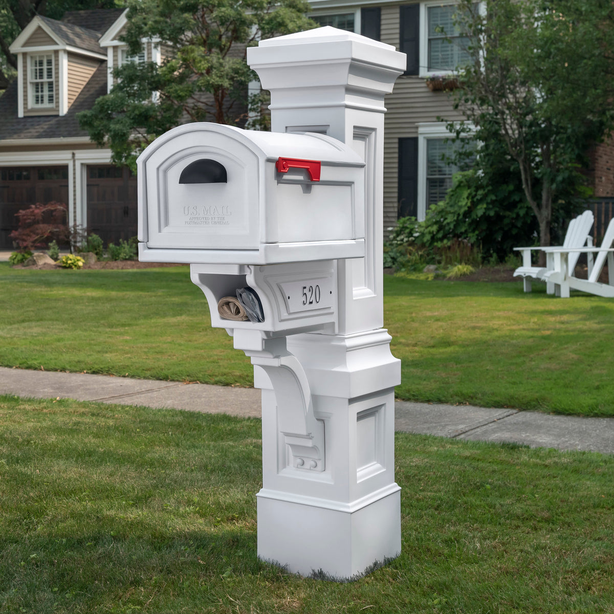 A stately, decorative mail post that has an aesthetic worthy of any estate