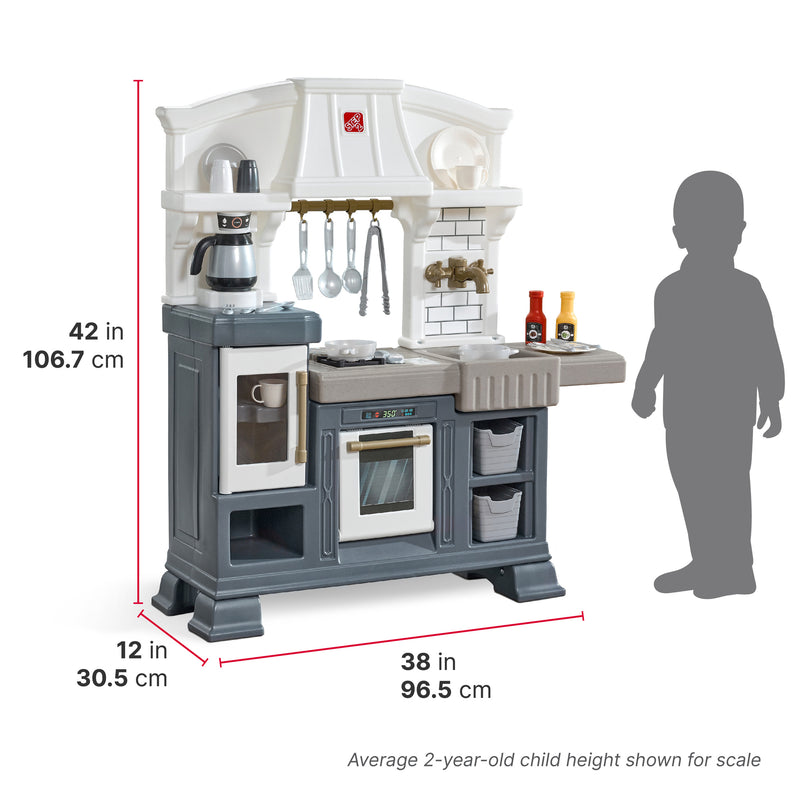• Realistic Features - Includes a windowed refrigerator, coffee station, range hood, and wall faucet