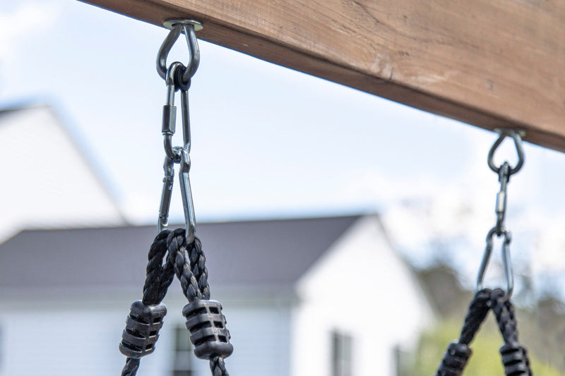 Let your little ones take flight in this rocket ship-themed swing for two! In addition to its nostalgic charm this kids swing uniquely offers face-to-face interaction for two children swinging at the same time – adding to their imaginative adventure. Solo riders are also welcome with an option to bring along a stuffed animal in the other seat. Double wall construction ensures this kids swing outlasts playtime for years to come. The high-quality rope is weather-resistant yet soft-touch for little hands. Rope length is optimized for 6' tall swing set bars. Easy-mount hardware can be used on most swing sets. Seatbelts and a t-bar for holding onto are included for a safe and secure ride. Made in USA of US and imported parts.