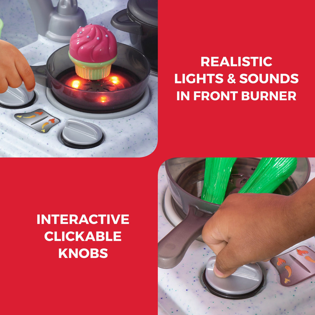 Mini pastry chefs will adore this pretend play kitchen full of realistic features! From pretend appliances like the oven and refrigerator with real working doors to the molded-in sink with faucet and large granite-style counterto…