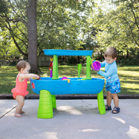 Rain Showers Splash Pond Water Table, 3 legs, canopy tray, 13-piece accessory set, water table cover, and assembly hardware