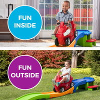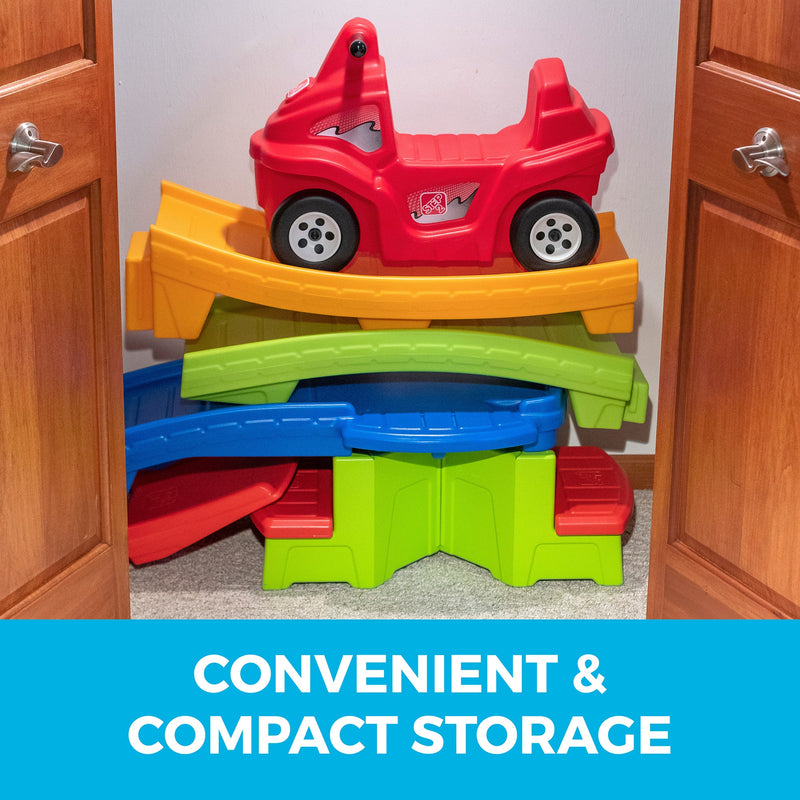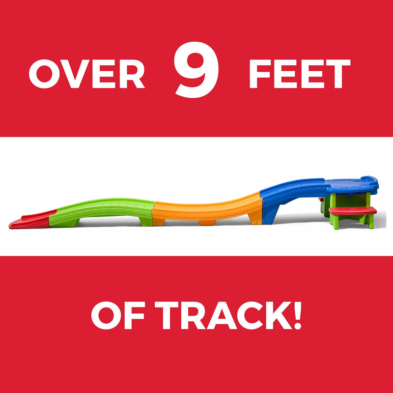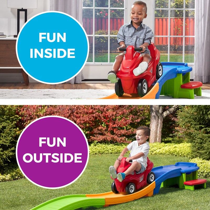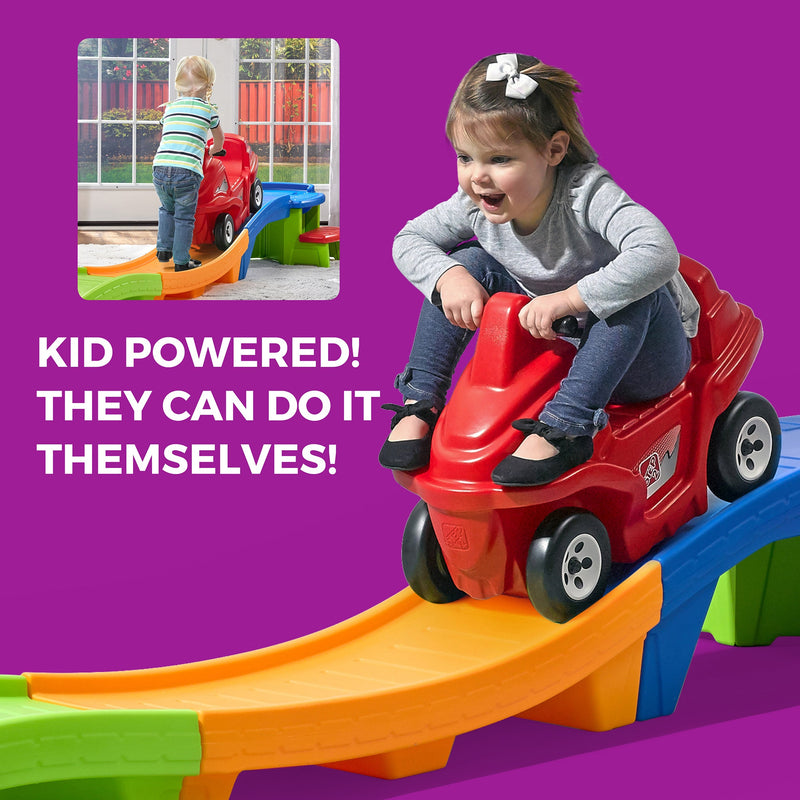 As the first to bring the excitement of a roller coaster to your child’s play space Step2 roller coaster toys are an exciting addition to any child’s indoor or outdoor play area. Experience the thrills of an amusement park roller coaster anytime with our Up & Down Roller Coaster Rapid Ride & Hide Edition™! Your toddler or preschooler can’t wait to cruise down the included 9 ft. of roller coaster track on the vibrant red ATV-style coaster car! They’ll practice gross motor skills by pushing the coaster car back up onto the platform as well as balance and hand-eye coordination while rapidly riding down the track. The ATV-style coaster toy car features a high back handrail and foot rests for a safe secure ride down the track; or for use off the coaster track as a riding toy! Kids will ride and then parents can “hide” this roller coaster toy when playtime fun is done– the coaster pieces easily come apart for convenient and compact storage if necessary. Made in USA of US and imported parts.