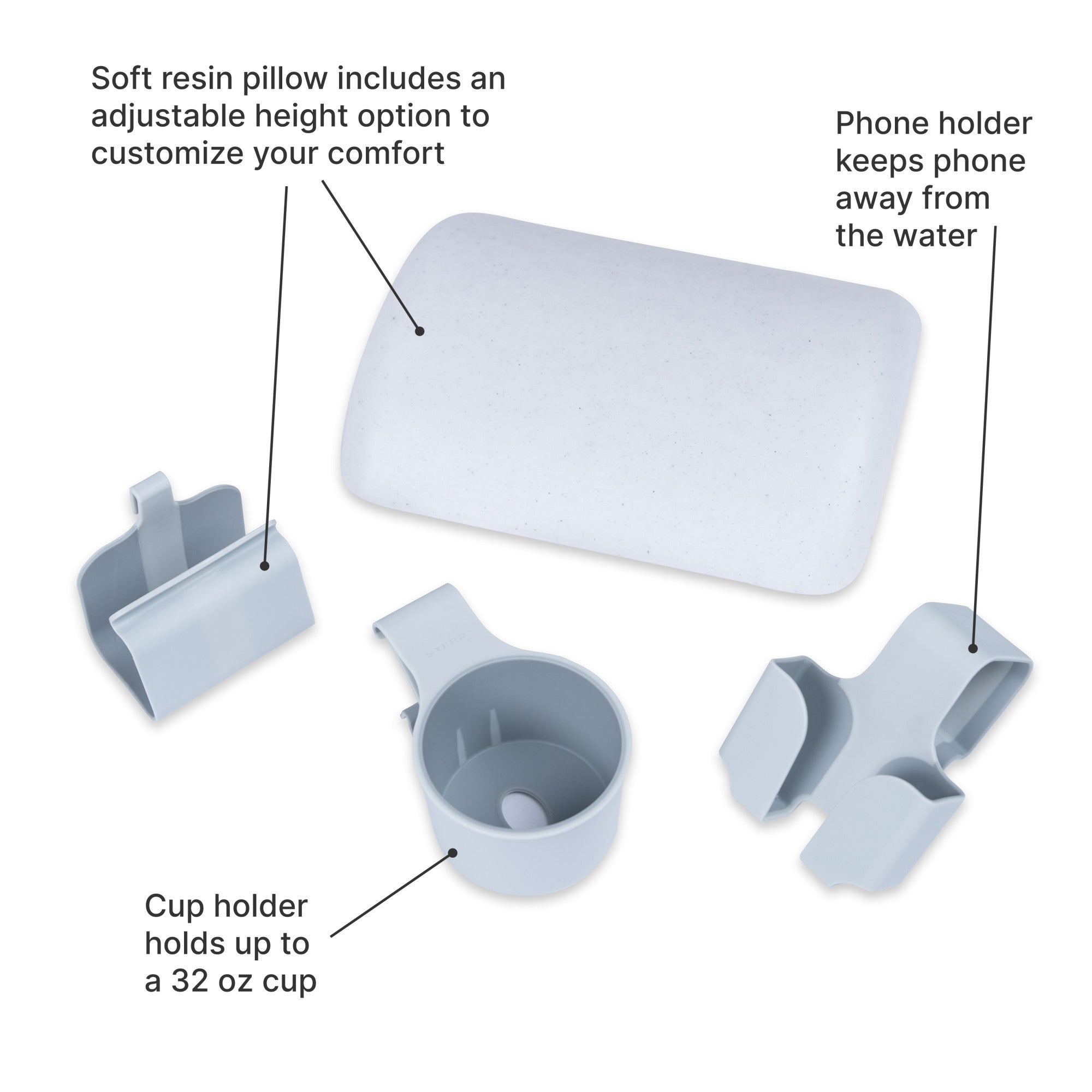 • Headrest Pillow - Features an adjustable height and a soft resin material that's comfortable and easy to clean